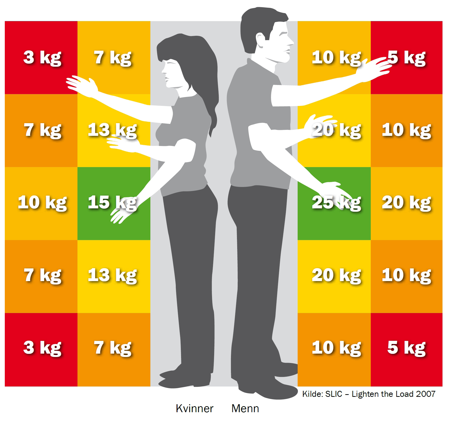 | Armer | Løftede, arbeider i/over skulderhøyde mer enn 3/4 arms avstand fra kroppen ofte/lange perioder | Løftede i perioder | Arbeidshøyde og -radius tilpasset arbeidsoppgave og arbeidstaker |